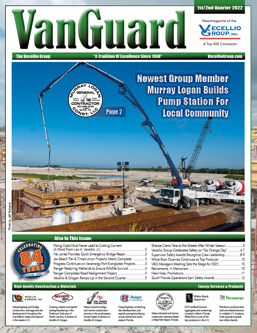 Click the cover image or links below for articles and photos about the companies, divisions and dedicated workforce of the Vecellio Group. Operations include Vecellio & Grogan and its Sharpe Bros. and Hal Jones Contractor divisions, Murray Logan Construction, Ranger Construction, and White Rock Quarries. The Group also includes Vecenergy, its energy division (South Florida Materials Corp., South Florida Petroleum Services, and Vecenergy’s petroleum products terminals in Florida, Georgia and Alabama).