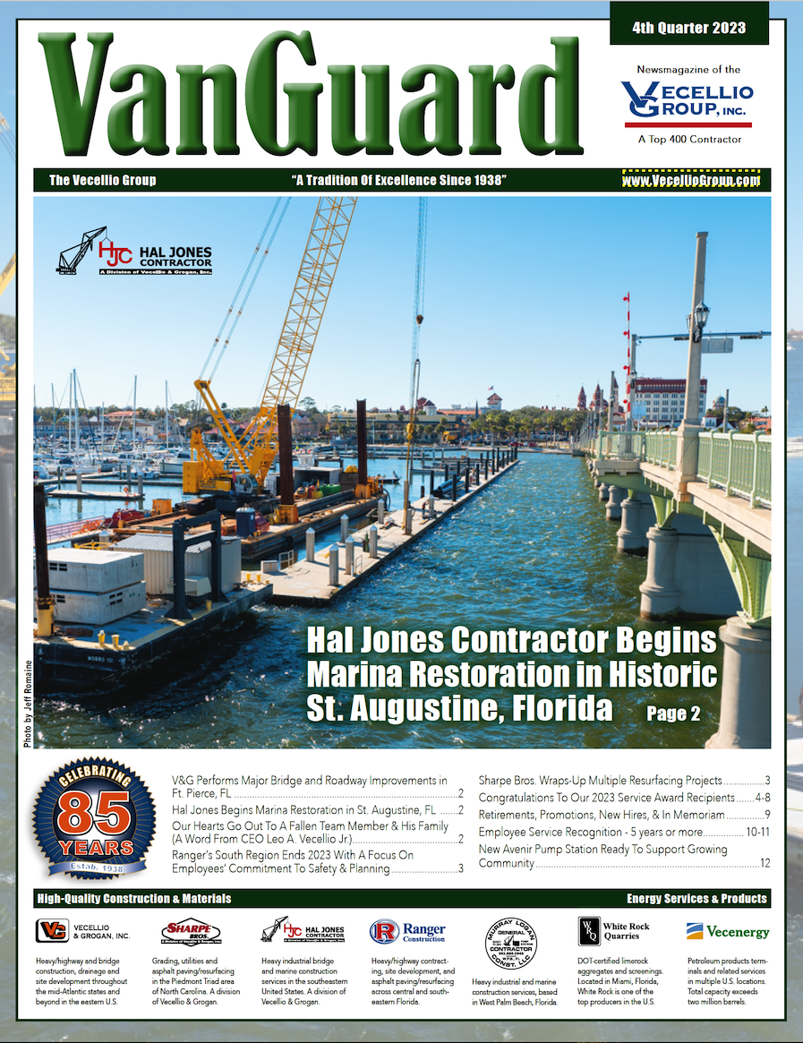 Also featured in this issue of VanGuard, the Vecellio Group’s award-winning newsmagazine, are Ranger Construction’s commitment to safety and planning. Sharpe Bros. wrapping up multiple resurfacing projects, and Murray Logan’s completion of a new community pump station supporting Avenir, a new residential community in Palm Beach Gardens, FL.